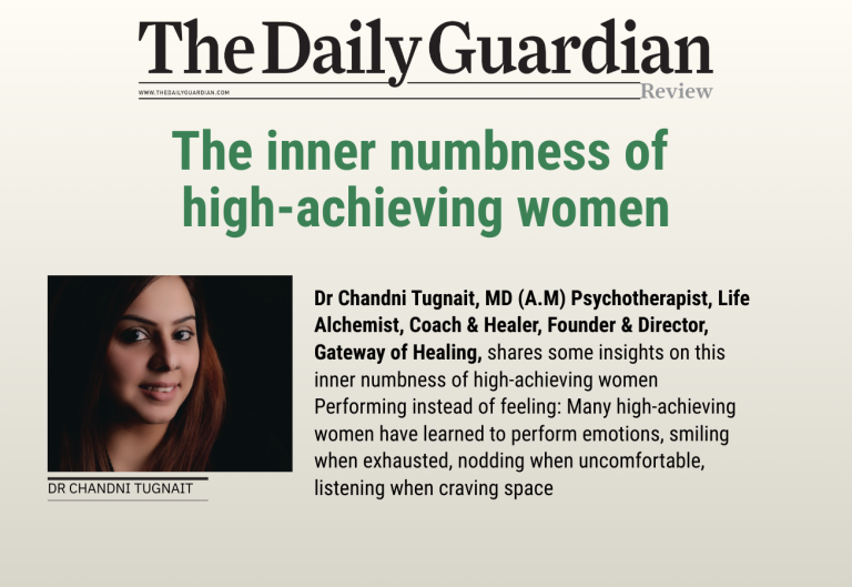 Dr Chandni Tugnait, MD (A.M) Psychotherapist, Life Alchemist, Coach & Healer, Founder & Director, Gateway of Healing, shares some insights on this inner numbness of high-achieving women Performing instead of feeling: Many high-achieving women have learned to perform emotions, smiling when exhausted, nodding when uncomfortable, listening when craving space. Their emotional radar becomes attuned to others while they lose touch with their own. They’re so used to being who they need to be in the room, they forget to ask: What do I feel in this moment?